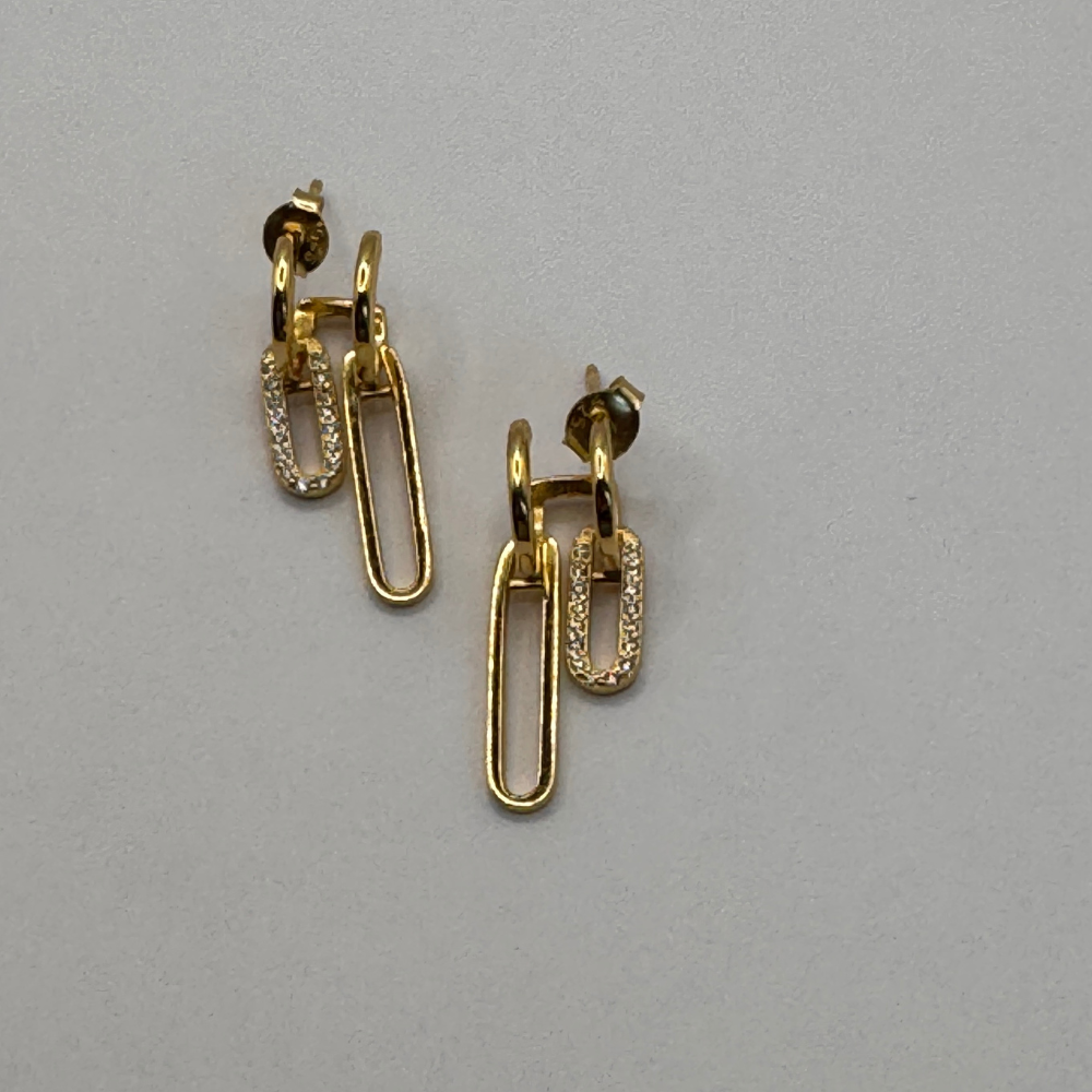 Aretes modernos con doble eslabón dorado en oro laminado 18k. Un diseño elegante y versátil que simboliza unión, conexión y estilo propio.